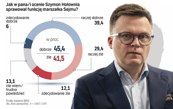 Jak samego marszałka Sejmu oceniają Polacy? Ewidentnie są podzieleni. W najnowszym badaniu IBRiS Hołownia (7-8 listopada) ma więcej zwolenników niż przeciwników: 45,4 proc. ankietowanych ocenia jego pracę jako marszałka Sejmu pozytywnie, przeciwnego zdania jest 41,5 proc. wyborców. Pozostali nie wyrobili sobie w tej sprawie zdania.