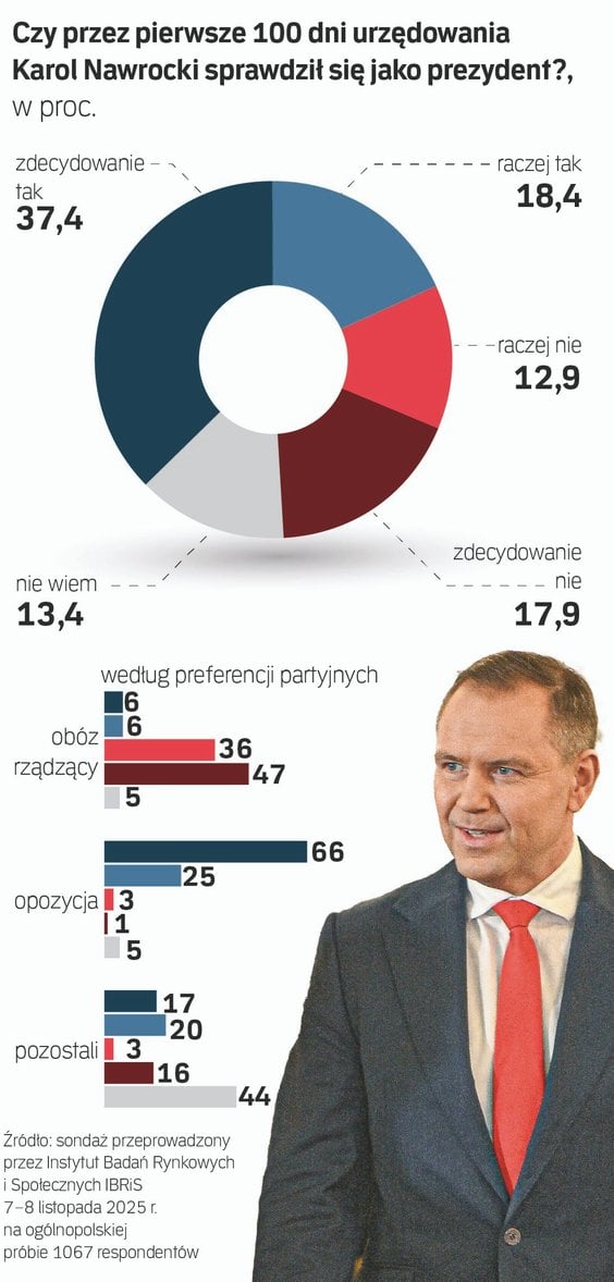 – Pierwsze miesiące pokazują asertywną i odważną prezydenturę – ocenia wicemarszałek Sejmu Krzysztof Bosak, prezes Ruchu Narodowego i jeden z liderów Konfederacji. Również większość badanych w sondażu IBRIS dla „Rzeczpospolitej” (55,8 proc. do 30,8 proc.) ocenia pozytywnie pierwsze 100 dni po zaprzysiężeniu prezydenta Karola Nawrockiego (mijają 14 listopada). Zdania w tej sprawie nie ma 13,4 proc.