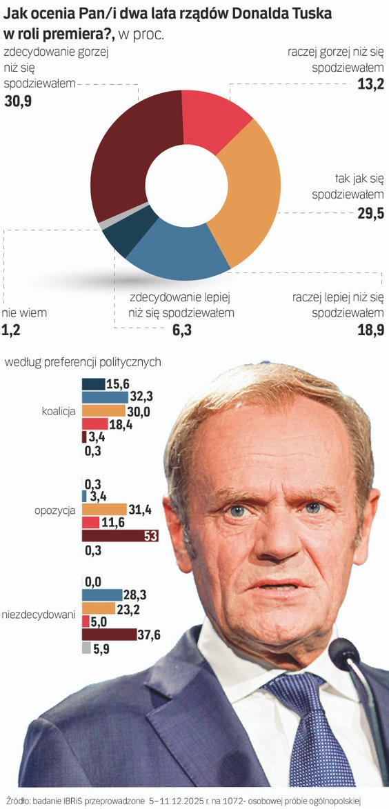 Władzę przejęła tzw. koalicja 15 października. Ale wizerunek Donalda Tuska raczej na tym ucierpiał. Na półmetku większość respondentów w sondażu IBRiS dla „Rzeczpospolitej” negatywnie ocenia jego dwa lata rządów. 18,9 proc. ankietowanych uważa, że sprawdził się raczej lepiej, niż się spodziewali, a 6,3 proc. – że zdecydowanie lepiej. Jednak aż 44,1 proc. ankietowanych uważa, że sprawował władzę poniżej oczekiwań. Przy czym aż 30,9 proc. zdecydowanie gorzej, a 13,2 proc. raczej gorzej. 29,5 proc. uważa, że rządził zgodnie z ich oczekiwaniami.