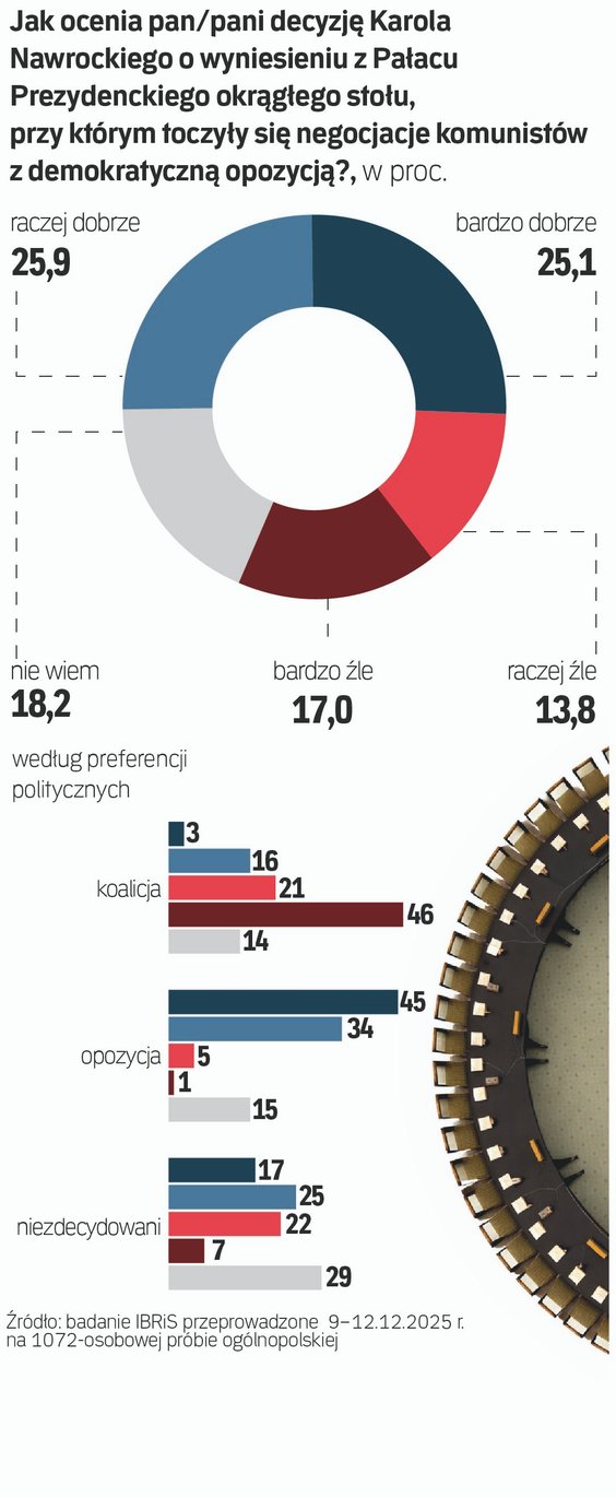 Jakub Wygnański, który brał udział w obradach okrągłego stołu (był asystentem Henryka Wujca), w TVN24 mówił o „przemocy symbolicznej”, a marszałek Sejmu Włodzimierz Czarzasty stwierdził, że to „zerwanie tych wszystkich zasad, które do tej pory budowały Polskę po transformacji” i „bardzo zły sygnał”. A jak decyzję o przeniesieniu okrągłego stołu z Pałacu Prezydenckiego do Muzeum Historii Polski oceniają Polacy? Na zlecenie „Rzeczpospolitej” zapytał o to IBRiS (próba: 1068; badanie zrealizowane w dniach 19-20 grudnia metodą telefonicznych, standaryzowanych wywiadów kwestionariuszowych wspomaganych komputerowo – CATI).