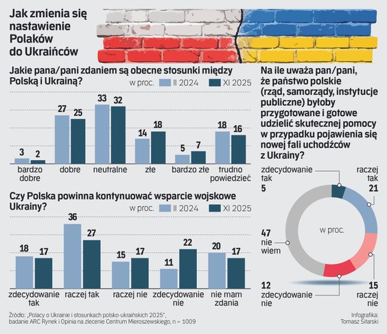 Aż 42 proc. Polaków zapytanych o zdanie uważa, że Polskę i Ukrainę łączą wspólne interesy, ale badanych różni ocena tego, ile ich jest – „wiele” odpowiedziało 22 proc. (to wzrost o 11 pkt. proc. w porównaniu do lutego 2024 r.), a „niewiele” odpowiedziało 20 proc. O tym, że Polski i Ukrainy nie łączą wspólne interesy jest przekonanych 28 proc. (to z kolei mniej w porównaniu do dwóch poprzednich pomiarów). Odpowiedzieć na to pytanie nie umie 30 proc. badanych. – To, że dostrzegamy, iż łączą nas wspólne interesy może wynikać z tego, że lepiej się poznaliśmy po pełnoskalowej agresji Rosji. Znaczenie może mieć również rozpoczęcie polskich prac ekshumacyjnych na Ukrainie – wspólnym wysiłkiem poprzedniego i obecnego rządu udało się w tym obszarze uzyskać mniej więcej tyle decyzji, co wcześniej na przestrzeni trzech dekad. A to przecież poważny problem w relacjach z Ukrainą zdaniem większości Polaków – konkluduje Cichocki.