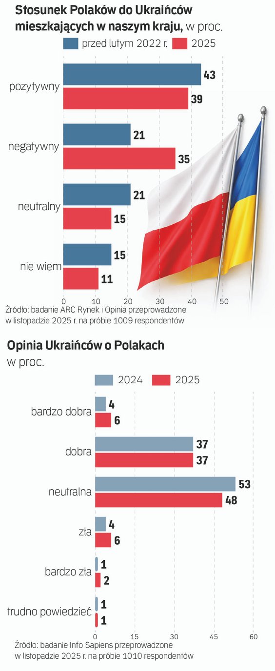 Podczas gdy 33 proc. ankietowanych postrzega Ukraińców jako konkurentów, 31 proc. widzi w nich partnerów gospodarczych. Tyle samo badanych mówi o Ukraińcach jako o sojusznikach. Dla 24 proc. Polaków to przyjaciele, 26 proc. uważa odwrotnie. Po świadczące o szczególnie bliskim stosunku do Ukraińców określenie – to bracia i siostry – sięga 17 proc. osób.