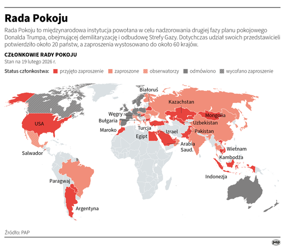 Pierwsze posiedzenie Rady Pokoju – nowej organizacji międzynarodowej powołanej przez prezydenta Donalda Trumpa – odbyło się w czwartek, 19 lutego w Waszyngtonie. Wzięli w nim udział przedstawiciele 49 państw, choć niewielu na szczeblu głów państw. Przemówienie Trumpa, trwające blisko godzinę, szybko stało się przedmiotem komentarzy ekspertów i wojskowych.