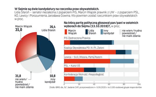 15 czerwca odbędzie się nadzwyczajne posiedzenie Sejmu poświęcone kolejnej, piątej próbie wyboru rzecznika praw obywatelskich. Zgodnie z sondażem przeprowadzonym przez IBRiS na zlecenie „Rzeczpospolitej" faworytem na stanowisko RPO wśród badanych jest kandydat opozycji i polityków Porozumienia – prof. Marcin Wiącek. Jego kandydaturę popiera 31 proc. badanych. Senator niezależna Lidia Staroń, zgłoszona przez PiS, otrzymuje wsparcie niższe o niespełna 5 punktów procentowych. Prawie 11 proc. wolałoby innego kandydata, a 1/3 badanych (31,8 proc.) nie ma zdania w sprawie obsadzenia stanowiska RPO.