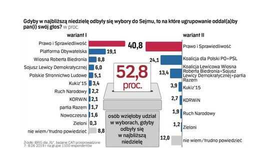 Wariant samodzielnego startu partii opozycyjnych jest dla nich zdecydowanie ryzykowny: PO nie przekracza 20 procent, PSL balansuje na granicy progu wyborczego, niewiele większe poparcie ma SLD. Nieznacznie odrabia straty z wyborów do Parlamentu Europejskiego Wiosna, notując prawie 9-procentowe poparcie.