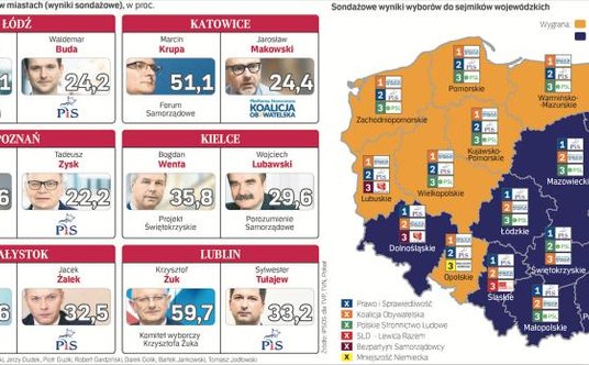Koalicja Obywatelska wygrała wybory w siedmiu województwach (kujawsko-pomorskim, lubuskim, opolskim, pomorskim, warmińsko-mazurskim, wielkopolskim i zachodniopomorskim) - wynika z tego samego sondażu.