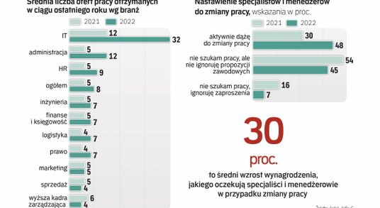 Wprawdzie prawie siedmiu na dziesięciu badanych dostało w ciągu ostatniego roku podwyżkę, ale w co piątym przypadku było to poniżej 5 proc. – niewiele jak na dwucyfrowy wzrost inflacji. Nic więc dziwnego, że najczęściej o aktywnych poszukiwaniach nowej pracy mówią ci specjaliści i menedżerowie, którzy w ciągu ostatniego roku nie odczuli poprawy swej sytuacji zawodowej. Ponad trzy czwarte z nich latem tego roku aktywnie szukało nowego pracodawcy. Niektórych mogła skłonić do tej aktywności zapowiedź zbliżającej się recesji – chcieli poprawić swoje warunki pracy (i zarobki), zanim recesja zamrozi rekrutacje już w większości branż.