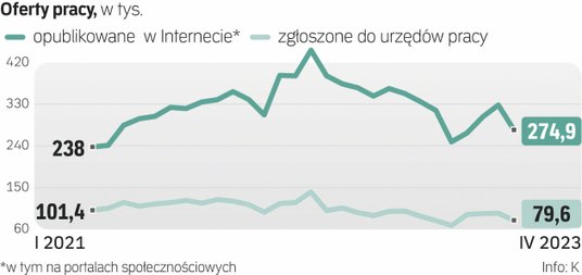 Osłabienie rekrutacji widać także w udostępnionym „Rzeczpospolitej” raporcie Grant Thornton i Element, które monitorują sytuację na 50 największych w Polsce portalach pracy. Tam również kwiecień był pierwszym miesiącem 2023 r., który przyniósł spadek liczby ogłoszeń w ujęciu miesięcznym. Na największych portalach rekrutacyjnych opublikowano niespełna 270 tys. ofert pracy, o ponad 17 proc. mniej niż w marcu i o 13 proc. mniej niż rok wcześniej.