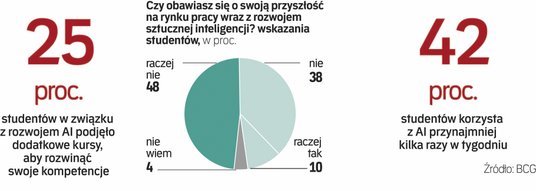 Młodych ludzi pytano m.in. o przewidywania na zawodową przyszłość w kontekście rozwoju sztucznej inteligencji, której zdecydowana większość z badanych (90 proc.) nie traktuje jako zagrożenia na rynku pracy. Co czwarty student zdecydował się jednak na dodatkowe kursy, by rozwinąć swoje kompetencje i lepiej przygotować się do nowych warunków.