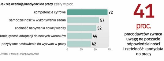 – Pracodawcy poszukują u kandydatów połączenia umiejętności zawodowych, wiedzy oraz kompetencji osobistych – twierdzi Katarzyna Pączkowska, dyrektor rekrutacji stałej w Manpower. Jak wyjaśnia, odpowiedzialne i rzetelne osoby dają gwarancję, że powierzone zadania będą starały się zrealizować jak najlepiej, dotrzymując też wyznaczonych terminów. To cechy, które nie tylko zwiększają szanse na powodzenie prowadzonych projektów, ale również dają duży komfort zarządzania menedżerom.