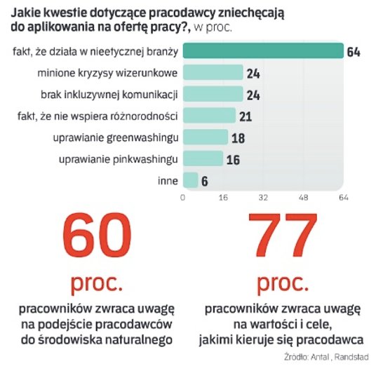 Również inne badania wskazują na to, że Polacy zwracają uwagę na te aspekty wizerunku pracodawców, które są związane z podejściem firm do etyki i ESG (czyli z dbałością o środowisko naturalne, otoczenie społeczne i ład korporacyjny). Według tegorocznej edycji Workmonitora, badania agencji zatrudnienia Randstad, które objęło 27 tys. pracowników z 34 państw, w tym z Polski, w ocenie obecnego lub przyszłego pracodawcy najważniejsze są warunki pracy, w tym płaca, stabilność zatrudnienia, benefity i work-life balance (wskazane przez ponad 95 proc. pracowników). Jednak aż 60 proc. badanych bierze pod uwagę stanowisko i działania firmy w kwestiach środowiskowych, a jeszcze więcej, bo 64 proc., patrzy na jej podejście do kwestii różnorodności i zrównoważonego rozwoju.