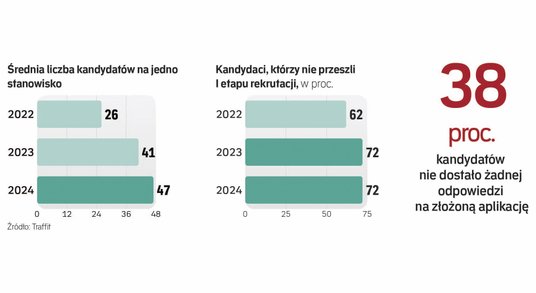 Kandydaci muszą się mierzyć z dużo większą konkurencją, a często także z frustracją wywołaną przez brak odzewu na aplikację czy wydłużony proces rekrutacji. Według analizy Traffit w przypadku skutecznych kandydatów (którzy przeszli wstępną selekcję) średni czas trwania pierwszego etapu rekrutacji wydłużył się ze 168 godzin w 2022 r. do 198 godzin obecnie (z siedmiu do prawie dziewięciu dni). W dodatku dzisiaj jest znacznie trudniej niż przed dwoma laty przejść przez pierwsze sito rekrutacyjne do etapu rozmowy kwalifikacyjnej czy próbnego zadania.