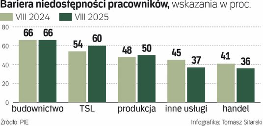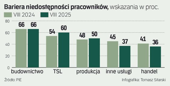 W porównaniu z sierpniem 2024 r. najbardziej pogorszyła się sytuacja pracodawców w transporcie i logistyce. Odsetek przedsiębiorstw narzekających na niedostępność pracowników wzrósł tam w ciągu roku z 54 proc. do 60 proc. pomimo większego napływu obcokrajowców, którzy są często zatrudniani w magazynach i centrach logistycznych.