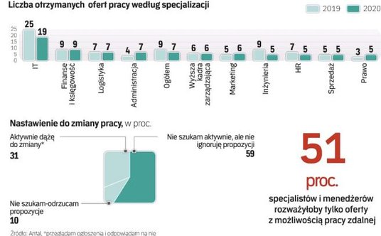 Największy spadek popytu odczuli w skali roku specjaliści IT. Jednak i tak to oni mieli największy wybór ofert pracy; dostawali w tym roku średnio po 19 propozycji. To o jedną czwartą mniej niż przed rokiem, lecz prawie trzykrotnie powyżej średniej w badaniu. I prawie czterokrotnie więcej niż prawnicy, którzy – jako jedna z nielicznych grup zawodowych – cieszą się większym wzięciem niż w 2019 r.