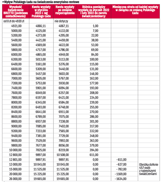 Kwota niedopłaty rośnie wraz z wysokością świadczenia. Przy emeryturze w wysokości 4921 zł (na rękę 4066,11 zł) wynosi tylko 1 zł. Przy świadczeniu w wysokości 5000 zł (4125 zł netto) niedopłata wyniosła już 7 zł, a przy 6000 zł emerytury czy renty (na rękę 4865 zł) niedopłata wzrosła już do 84 zł. Szczegółowe wyliczenia przygotowane przez Centralę ZUS w Warszawie znajdują się w ramce obok.
