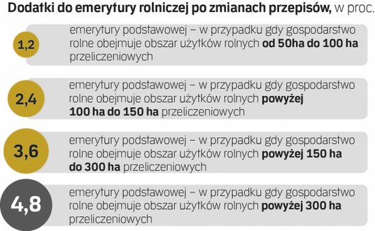 Natomiast zmiana, która spowoduje, że świadczeniobiorcy z KRUS będą jeszcze bardziej uprzywilejowani względem tych z ZUS, polega na dodaniu przepisu, na podstawie którego dużym rolnikom ma przysługiwać dodatek w wysokości od 1,2 proc. do 4,8 proc. (w zależności od wielkości gospodarstwa) do emerytury podstawowej za każdy rok opłacania dodatkowej składki.