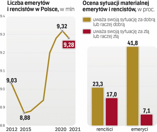 Z danych GUS wynika natomiast, że nieznacznie spadła kwota emerytur i rent wypłacanych z KRUS. W 2021 r. wyniosła 17,8 mld zł (spadek o 0,7 proc. względem 2020 r.).