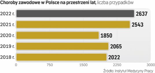 Z raportu Instytutu Medycyny Pracy im. prof. J. Nofera wynika, że w 2022 r. stwierdzono w Polsce 2637 przypadków choroby zawodowej. To więcej o 3,7 proc. niż rok wcześniej (kiedy było ich 2543).