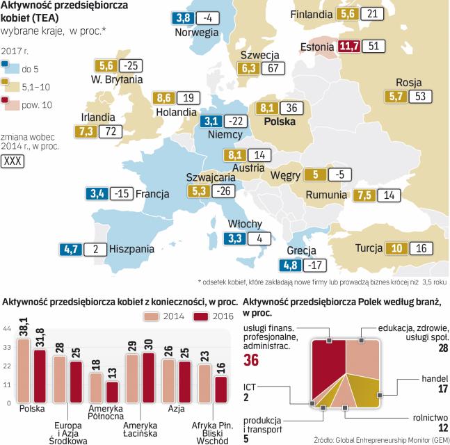 Zachód zaniża zresztą wskaźnik zaangażowania w przedsiębiorczość w Europie na czele z Niemcami, gdzie aktywność biznesowa kobiet spadła w ostatnich latach o ponad jedną piątą, do 3,1 proc. Średnią podwyższają z kolei Estonia i Turcja, gdzie odsetek młodej przedsiębiorczości wśród pań sięga odpowiednio 11,7 i 10 proc.