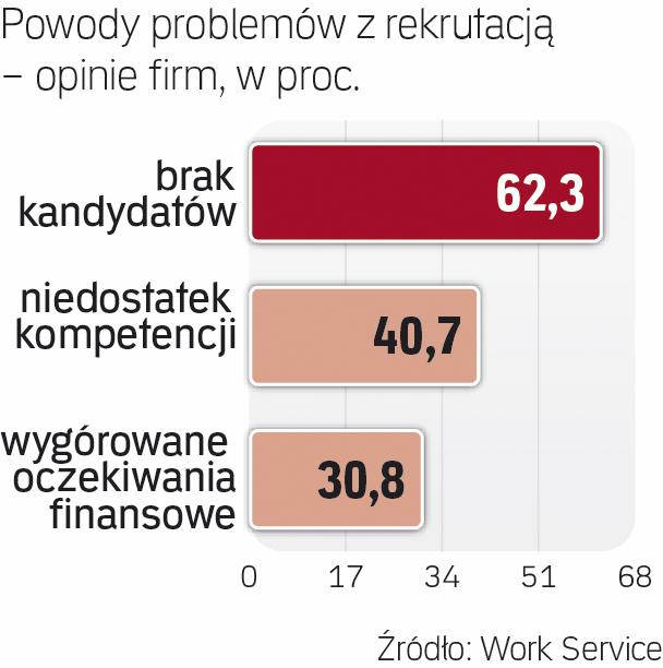 Znacznie częściej problemy rekrutacyjne deklarują dzisiaj pracodawcy. W badaniu Work Service niemal 51 proc. firm przyznaje, że w ostatnich miesiącach miały trudności z pozyskaniem kandydatów do pracy. Najczęściej wynikało to z braku chętnych albo ich niewystarczających kompetencji. Rzadziej narzekano na wygórowane oczekiwania finansowe.