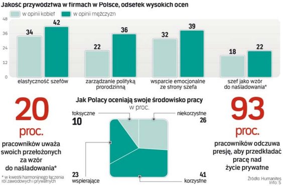 W tegorocznej ankiecie, która objęła 788 pracujących kobiet i mężczyzn (w tym osoby na stanowiskach menedżerskich), aż 64 proc. badanych pozytywnie oceniło swój dobrostan w pracy – określając środowisko pracy jako korzystne lub wzbogacające. To o trzy czwarte większa grupa niż przed dwoma laty; w 2019 r. aż 63 proc. pracowników w Polsce mówiło o niekorzystnym lub wręcz toksycznym (17 proc.) środowisku pracy. Dzisiaj odsetek tych najbardziej negatywnych ocen spadł do 10 proc. To nawet poniżej średniej na świecie (12 proc.)