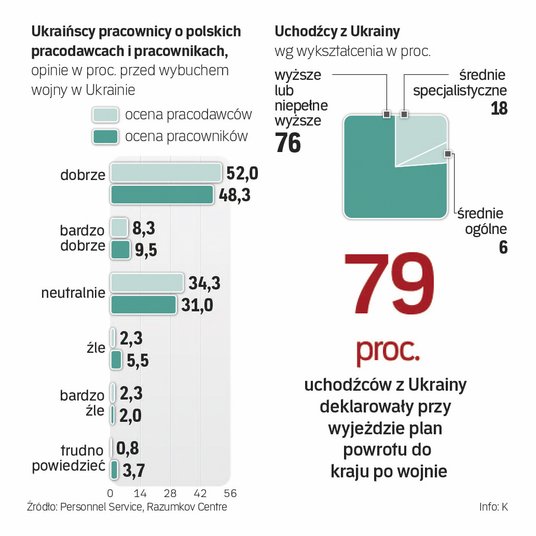 Butkaliuk przypomina ogłoszone w ubiegłym tygodniu wyniki raportu ukraińskiego think tanku Centrum Razumkowa, które przebadało 101 uchodźców przekraczających granicę ze Słowacją. Ponad trzy czwarte z nich miało wyższe wykształcenie, a największą grupę stanowili wysoko wykwalifikowani specjaliści (26 proc.), przedsiębiorcy (20 proc.) i robotnicy wykwalifikowani fachowcy (17 proc.). Również w Polsce, wśród prawie 2,7 mln uchodźców, którzy wjechali do naszego kraju, sporą grupę stanowią specjaliści i przedsiębiorcy.