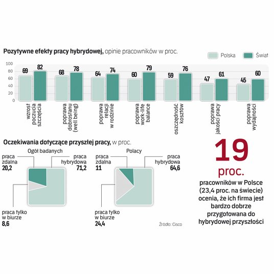 Ponad sześciu na dziesięciu pracowników, którzy w czasie pandemii pracowali w modelu hybrydowym (zwykle ze znaczącym udziałem pracy zdalnej), jest przekonanych, że dzięki temu poprawiła się nie tylko jakość, ale także wydajność ich pracy. Tak wynika z udostępnionego „Rzeczpospolitej” globalnego badania firmy Cisco, które w pierwszym kwartale tego roku objęło ponad 28 tys. osób pracujących w pełnym wymiarze godzin w 27 państwach, w tym w Polsce.