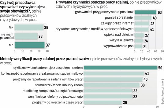 Ponad sześciu na dziesięciu pracujących zdalnie i hybrydowo użytkowników Pracuj.pl wskazało w ubiegłorocznym sondażu portalu, że pracodawcy na pewno, lub być może, kontrolują ich pracę, przy czym osób pewnych tej kontroli było nieco więcej (35 proc.). Ten trend potwierdzają wyniki badań pracodawców, które wskazują na utrzymującą się rezerwę wobec pracy poza biurem.