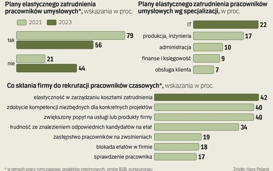 Niespełna sześć na dziesięć firm korzystających z czasowej pracy umysłowej będzie w tym roku zatrudniać specjalistów i menedżerów z zewnątrz. To grupa prawie o 30 proc. mniejsza niż w 2021 r., gdy takie plany miało prawie 80 proc. ankietowanych przedsiębiorstw – wynika z badania firmy rekrutacyjnej Hays Poland, które „Rzeczpospolita” opisuje jako pierwsza.