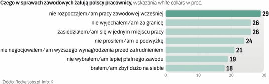 Czego najczęściej żałują? Przede wszystkim braku aktywności; największa grupa (29 proc.) wyrzuca sobie zbyt późne rozpoczęcie pracy zawodowej. Średnią podwyższają tu mężczyźni; prawie co trzeci żałuje, że nie zaczął pracować wcześniej, np. w trakcie studiów. Niewiele mniej, bo 26 proc. wszystkich badanych (i 30 proc. mężczyzn), żałuje, że nie wyjechali do pracy za granicę albo że częściej nie zmieniali pracodawcy i „zasiedzieli się” w jednym miejscu. Tym bardziej że z obserwacji ekspertów HR wynika, że zmiana pracodawcy jest w Polsce najbardziej skutecznym sposobem zdobycia wyższego wynagrodzenia.