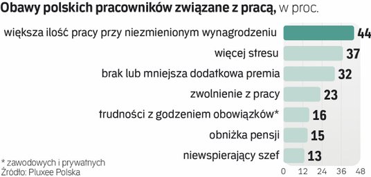 Większość z nich ma różnego rodzaju obawy, wśród których na pierwsze miejsce wysuwa się ta związana z większą ilością pracy przy niezmienionym wynagrodzeniu. I nie bez podstaw, skoro aż 35 proc. ankietowanych dostrzega w swoim miejscu pracy praktyki zwiększenia zakresu obowiązków bez podwyżki płacy. Jak komentują eksperci Pluxee, obawa związana z większą ilością pracy wiąże się poniekąd z niepokojem dotyczącym redukcji zatrudnienia, tym bardziej że jedna trzecia badanych dostrzega trudną sytuację finansową swojej firmy i brak podwyżek.