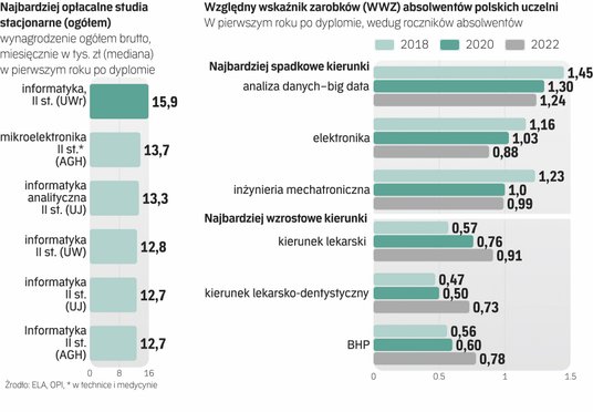 Jak jednak podkreślają eksperci Ośrodka Przetwarzania Informacji (OPI), który opracowuje dane ELA, w całej populacji osób kończących studia widać tendencję wzrostu wynagrodzeń. I nie chodzi tylko o nominalny wzrost płac, ale o względny wskaźnik zarobków (WWZ), który pokazuje medianę wynagrodzenia absolwenta w pierwszym roku po dyplomie w stosunku do średnich zarobków w jego miejscu zamieszkania.