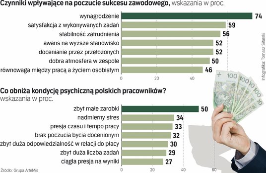 Wymieniając wartości cenione w pracy, a także czynniki wpływające na poczucie sukcesu zawodowego polscy pracownicy i menedżerowie najczęściej wskazują wynagrodzenie. Ono też (jeśli jest zbyt niskie) motywuje ich najczęściej do zmiany pracy będąc też jednym z głównych powodów wypalenia zawodowego – dowodzi raport „Sukces na miarę zdrowia”, w którym Grupa ArteMis podsumowała wyniki przeprowadzonego wiosną tego roku badania pracujących Polaków.
