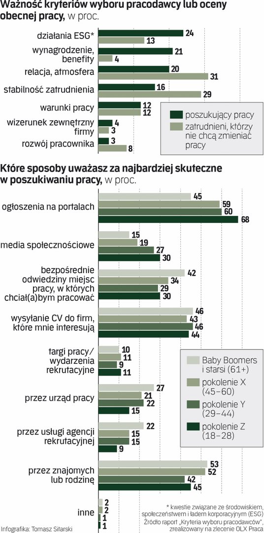 Jak wynika z badania OLX Praca, istnieje zbieżność pomiędzy tym, jakie metody respondenci uważają za najbardziej efektywne przy rekrutacji, a jakie znaczenie ma dla nich dobra atmosfera w pracy, równowaga pomiędzy życiem zawodowym i prywatnym oraz stresem. Dla Baby Boomers i starszych (61+) oraz pokolenia X (45-60 lat) pomoc znajomych i rodziny jest bardziej cenna i efektywna niż odpowiadanie na ogłoszenia w portalach. Gdy poproszono o wskazanie najbardziej skutecznej metody poszukiwania pracy – uznało tak 22 proc. przedstawicieli Baby Boomers i 28 proc. pokolenia X. Ponad połowa tych respondentów wymieniła też osobiste koneksje jako sposób poszukiwania nowej pracy. Młodsi na pierwszym miejscu postawili ogłoszenia o pracę, choć wciąż czterech na dziesięciu respondentów liczy na bliskich.