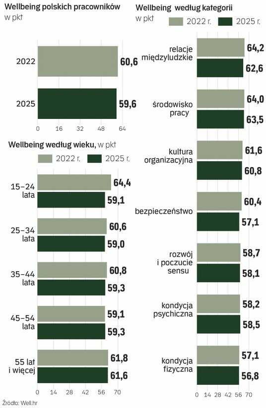 „Rzeczpospolita” jako pierwsza opisuje te wyniki, które pokazują pogorszenie poczucia dobrostanu wśród większości pracujących Polaków. Ogólny wskaźnik wellbeingu spadł na przestrzeni trzech lat do 59,6 pkt., czyli o jeden punkt procentowy w porównaniu z 2022 r. (60,6 pkt.)). Zdaniem ekspertek Well.hr, stawia to pod znakiem zapytania deklarowaną przez pracodawców troskę o dobrostan pracowników, a także skuteczność podejmowanych przez nich działań i poziom ich dopasowania do potrzeb pracowników.