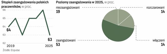 Badanie dowodzi, że nie jest z nim najlepiej – ogólny poziom zaangażowania pracowników zmalał w ub. r. do 63 proc., o 3 pkt. proc. w porównaniu z 2024 r. Jak zauważa Magdalena Pietkiewicz, która była też inicjatorką badania, ten spadek może wydawać się niewielki, lecz w przypadku wskaźników ogólnych każda różnica procentowa jest istotna. Co więcej, był to pierwszy spadek od 2021 r., gdy nastroje pracowników pogarszała druga fala pandemicznych lockdownów.