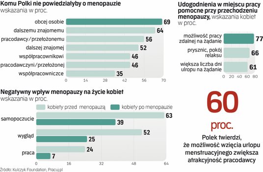 Większość kobiet nie chce się przyznawać do objawów menopauzy z obawy o swoją pozycję zawodową. Prawie sześć na dziesięć uczestniczek badania (56 proc.) wskazało, że nie powiedziałyby o swojej menopauzie pracodawcy czy przełożonemu, a prawie co druga nie poinformowałaby też o tym szefowej czy pracodawczyni. W zmianie tego podejścia powinien pomóc skierowany do pracodawców konkurs RównoWaga – na prokobiecą firmę roku, zorganizowany przez Kulczyk Foundation Kongres Kobiet i Konfederacja Lewiatan pod patronatem medialnym „Rzeczpospolitej”.