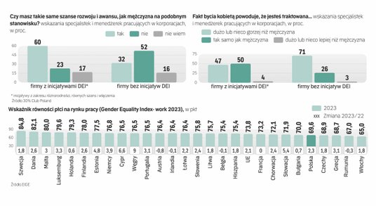 Znaczenie systemowych działań i rozwiązań zgodnie podkreślają ekspertki i badaczki zajmujące się sytuacją kobiet na rynku pracy, w tym kwestią ich niewielkiego wciąż udziału we władzach spółek czy luką płacową ze względu na płeć. Efekt braku systemowego podejścia widać w statystykach, w tym w najnowszym raporcie Gender Equity Index 2023 przygotowanym przez Europejski Instytut ds. Równości Kobiet i Mężczyzn. Polska, pomimo pewnej poprawy od 2022 r., zajęła w nim 18. miejsce w UE pod względem ogólnego równouprawnienia płci, plasując się dopiero na 23. miejscu pod względem równouprawnienia na rynku pracy. Mało optymistyczny obraz pokazuje też październikowa analiza GUS. Według niej w zeszłym roku przeciętne miesięczne wynagrodzenie mężczyzn było w Polsce o 17,6 proc. wyższe od płacy kobiet, a ta różnica zwiększyła się prawie o 3 pkt proc. od poprzedniej edycji badania w 2020 r.