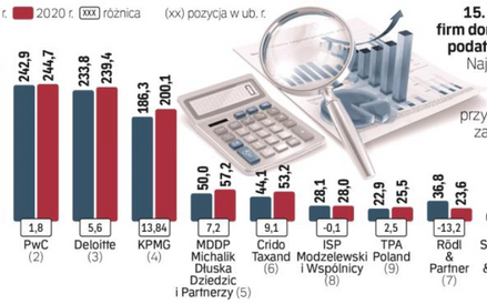 Redakcja „Rzeczpospolitej” po raz piętnasty zorganizowała ranking firm doradztwa podatkowego. Z naszego zestawienia wynika, że mimo iż 2020 r. był trudny dla doradców, to zyski większości firm poszły w górę. Najwyższe przychody, ponad 281 mln zł, odnotował EY. Największą firmą pozostaje niezmiennie Deloitte, dla której pracuje 191 licencjonowanych doradców. Najwięcej spółek giełdowych obsługują: PwC (118) i KPMG (112).