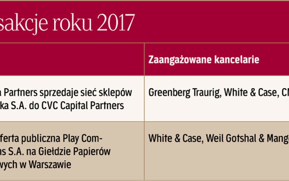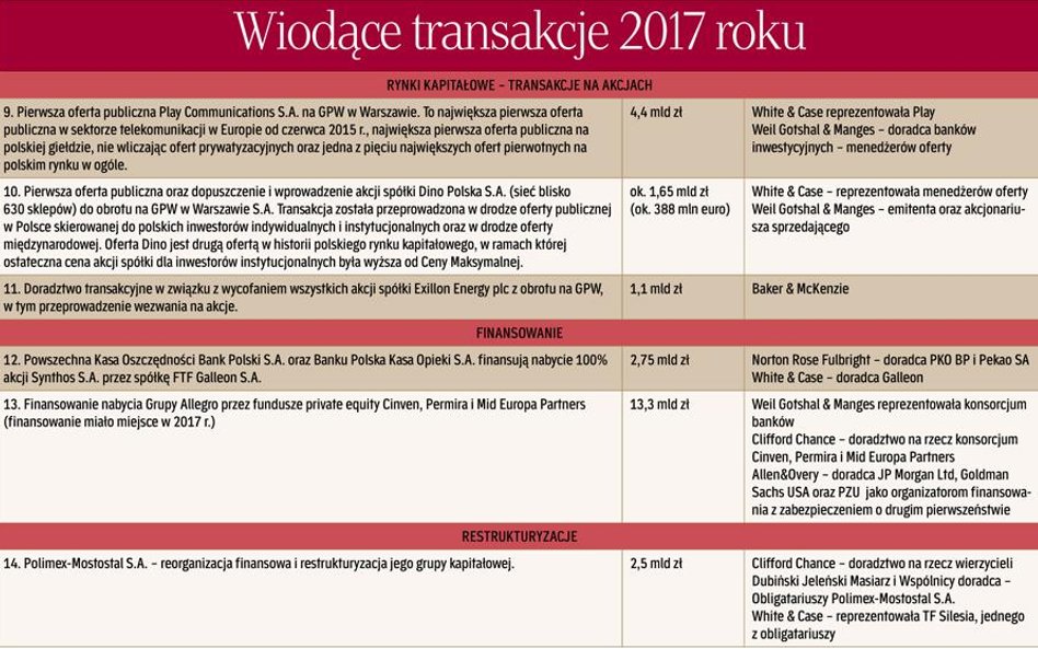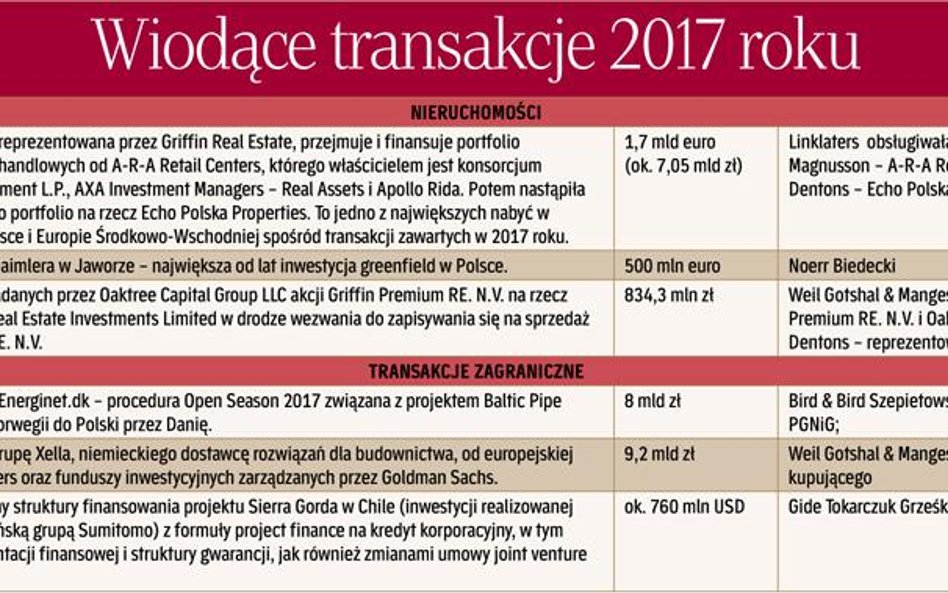 Kapituły przyglądały się około 100 największym transakcjom, zgłoszonym przez kancelarie biorące udział w naszym rankingu. Prace wszystkich zespołów pozwoliły na wyłonienie 20 kontraktów najbardziej doniosłych dla polskiego rynku (str. 28–29). Dwie najważniejsze transakcje roku wybrała kapituła główna. Warunkiem zaliczenia danej operacji do zestawienia było jej zakończenie lub zasadnicze zakończenie w 2017 roku.