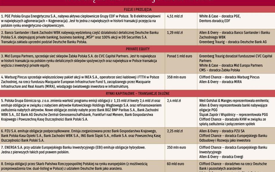 Wiodące transakcje, tak jak w poprzednich latach, klasyfikujemy w ośmiu kategoriach: fuzji i przejęć, transakcji funduszy inwestycyjnych (private equity), rynków kapitałowych – transakcji dłużnych, rynków kapitałowych – transakcji na akcjach, finansowania, restrukturyzacji, nieruchomości i transakcji zagranicznych. Jednak ze względu na specyfikę każdej z tych kategorii w tym roku po raz pierwszy powołaliśmy osobne kapituły dla wyróżnienia wiodących transakcji w poszczególnych kategoriach >patrz ramka str. 26 „Lista ekspertów z różnych segmentów polskiego rynku". Pozwoliło to ekspertom z poszczególnych segmentów rynku na lepszą weryfikację transakcji.