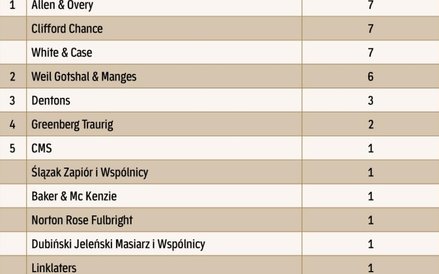 Każdy z wielkich kontraktów był obsługiwany przez co najmniej jedną kancelarię prawniczą. Spośród owych kancelarii wyróżniliśmy te, które obsłużyły najwięcej wybranych przez kapitułę transakcji. W ten sposób powstała klasyfikacja kancelarii obsługujących najbardziej znaczące operacje gospodarcze na polskim rynku >patrz tabela obok. Licząc udział firm prawniczych w transakcjach, na potrzeby naszego zestawienia braliśmy pod uwagę wyłącznie kancelarie działające na polskim rynku i biorące udział w rankingu.