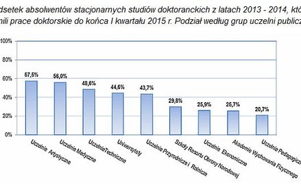 Stosunkowo łatwa dostępność studiów doktoranckich może powodować obniżenie jakości kształcenia kadr naukowych. Spośród 261 zbadanych przez NIK absolwentów tych studiów z lat 2013-2014, jedynie 108 (ok. 41 proc.) uzyskało stopień doktora. Warto zauważyć, że jednostki prowadzące studia doktoranckie w dziedzinie nauk ścisłych i medycznych osiągały wyższą skuteczność kształcenia - 66 proc. ich absolwentów zdobywało tytuł doktora, niż jednostki realizujące studia humanistyczne i społeczne - tam tytuł uzyskiwało ok. 27 proc. absolwentów.