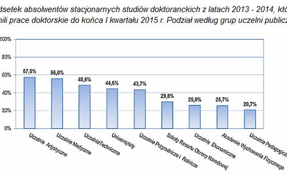 Taką tendencję potwierdzają również informacje zebrane od 82 podmiotów objętych badaniem kwestionariuszowym (72 uczelnie, dwa wydziały medyczne uniwersytetów, Centrum Medyczne Kształcenia Podyplomowego i siedem instytutów naukowych PAN). Spośród 7 681 doktorantów, którzy ukończyli stacjonarne studia doktoranckie w latach 2013 - 2014 w tych jednostkach, tylko niespełna połowa (3 423,ok. 45 proc.) uzyskała stopień naukowy doktora. W aż 30 ankietowanych jednostkach odsetek ten wyniósł mniej niż 25 proc., a tylko w jednej czwartej przekroczył 56 proc. Również i w tym przypadku uczelnie medyczne i techniczne wypadały lepiej, i uzyskały wyższą skuteczność kształcenia (odpowiednio 56 proc. i ok. 49 proc.) od uniwersytetów i uczelni pedagogicznych (odpowiednio ok. 45 proc. i ok. 21 proc.).