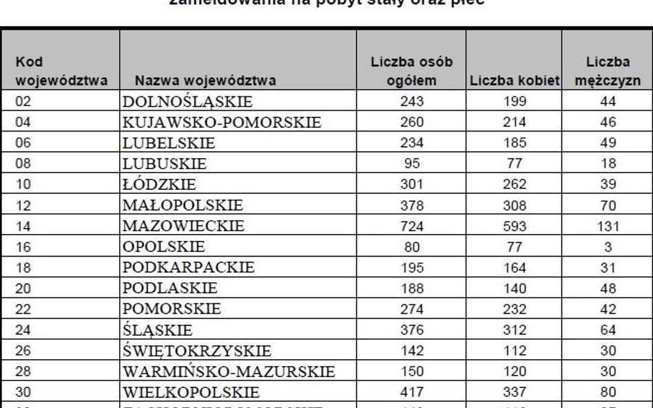 Najwięcej osób mających 100 lat i więcej jest zameldowanych w województwach: mazowieckim (724 osoby), wielkopolskim (417 osób), małopolskim (378 osób) i śląskim (376 osób). W województwach tych najwięcej jest kobiet i mężczyzn w wieku minimum 100 lat.