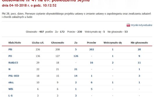 Nad obywatelskim projektem, który przewidywał likwidację obowiązku szczepień ochronnych Sejm debatował w środę. Klub PiS złożył wniosek o skierowanie projektu do prac w komisjach zdrowia oraz polityki społecznej i rodziny.