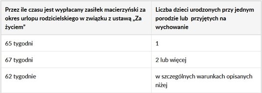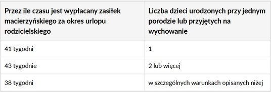 Zasiłek macierzyński został wydłużony o 9 tygodni tj. z 32 do 41 tygodni dla jednego dziecka i z 34 do 43 tygodni dla więcej niż jednego dziecka. A jeśli dziecko jest w rodzinie zastępczej lub ma trudności zdrowotne wpływające na obowiązek szkolny, zasiłek może być wypłacany przez 38, 62, 65 lub 67 tygodni.