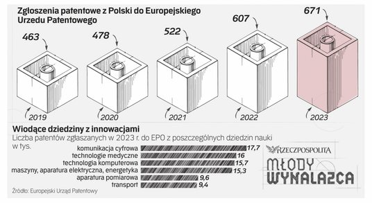 Choć pod względem wynalazczości Polsce jeszcze daleko do światowej czołówki, to w ostatnich latach widać ożywienie. W 2023 r. do Europejskiego Urzędu Patentowego (EPO) trafiło z naszego kraju 671 wniosków, czyli ponad 10 proc. więcej niż rok wcześniej. Także Urząd Patentowy RP (UPRP), zajmujący się krajową ochroną prawną wynalazków, odnotował w zeszłym roku wzrost zgłoszeń o 22 proc.