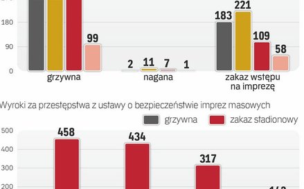 W sumie w 2013 i 2014 r. wszczęto postępowanie w stosunku do tysiąca stadionowych chuliganów (wykroczenia i przestępstwa). W 2015 r. było 900 spraw, a w pierwszej połowie 2016 r. 446. Mniej jest też grzywien: z 300 w 2013 r. spadła do 100 w pierwszej połowie tego roku. Ubywa też zakazów stadionowych: 641 w 2013 r., 200 w pierwszych sześciu miesiącach 2016 r.