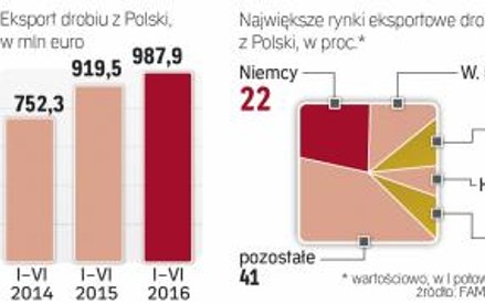Produkcja drobiu rośnie nad Wisłą głównie za sprawą eksportu. W tym roku, jak szacuje IERiGŻ, sprzedamy za granicę 1123 tys. ton mięsa drobiowego, o 17 proc. więcej niż w 2015 r. Dodatnie saldo w jego handlu zagranicznym może przekroczyć 1,9 mld euro. Przed rokiem wyniosło niespełna 1,7 mld euro.